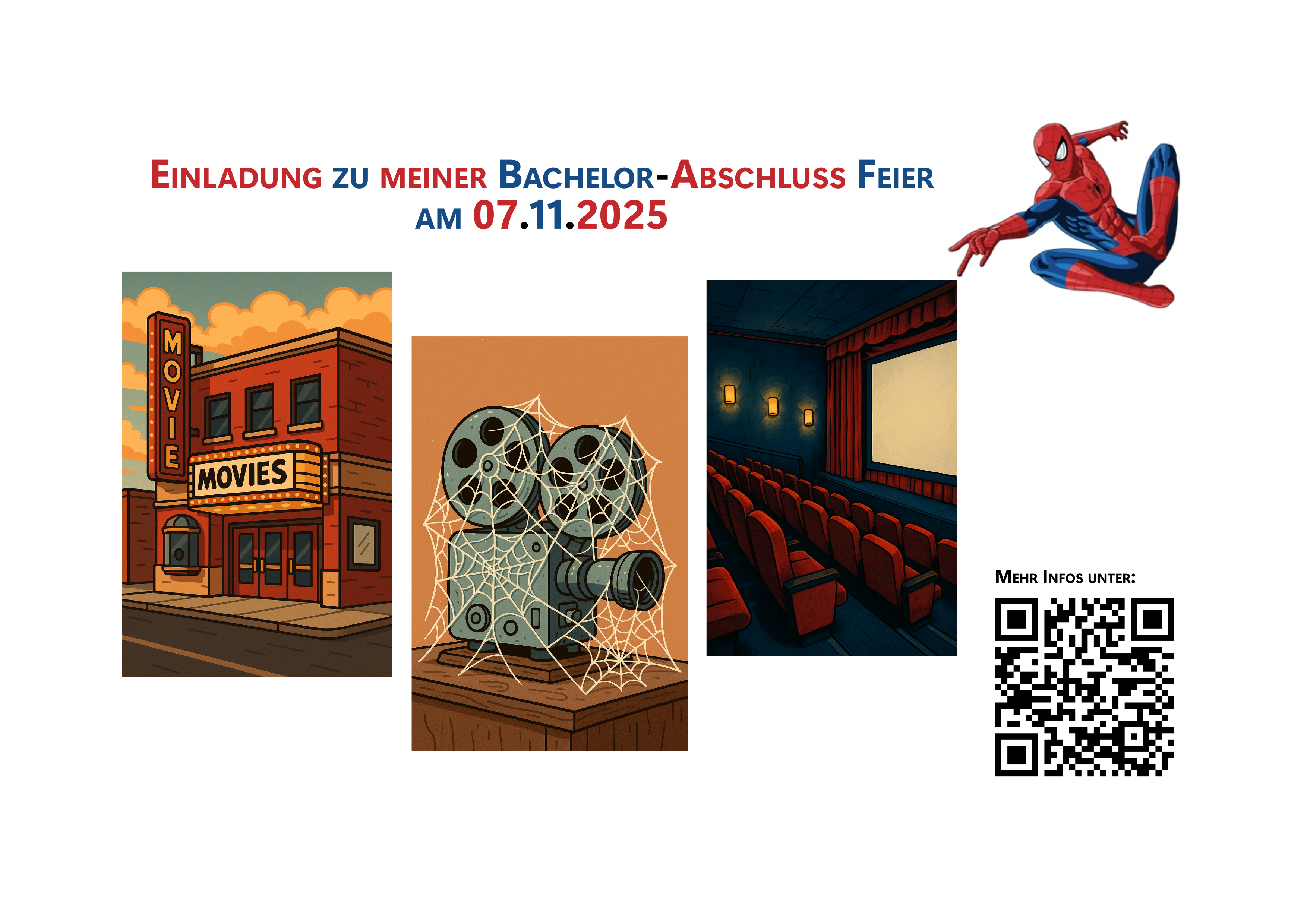 Hiermit seit ihr herzlich eingeladen zu meiner Bachelor-Abschluss Feier. Ich habe einen Kinosaal im Cineplex gemietet und möchte mit euch einen meiner Lieblingsfilme der vergangenen Jahre gucken: "Spider-Man: Into the Spiderverse". Ich freue mich euch zu sehen!